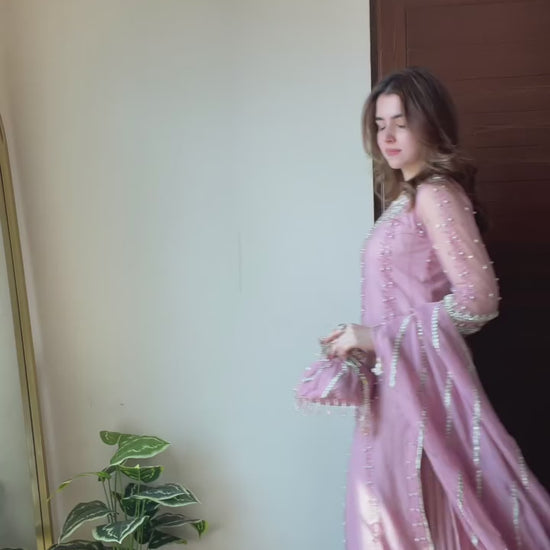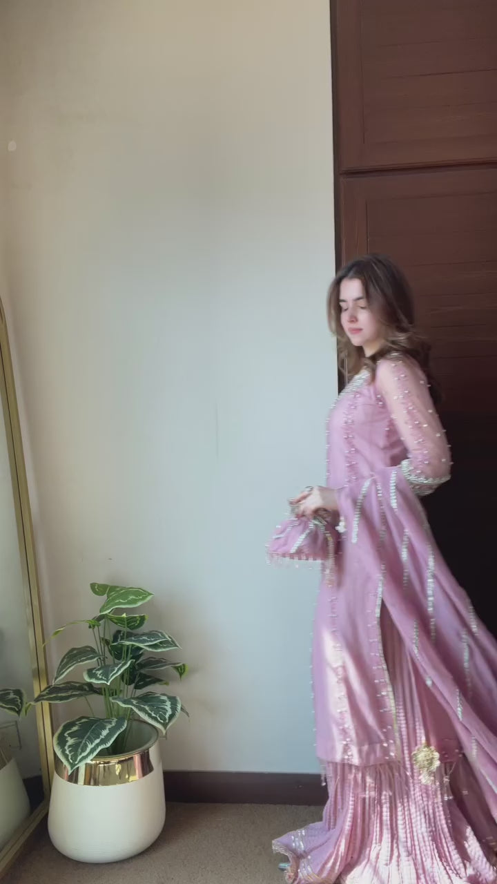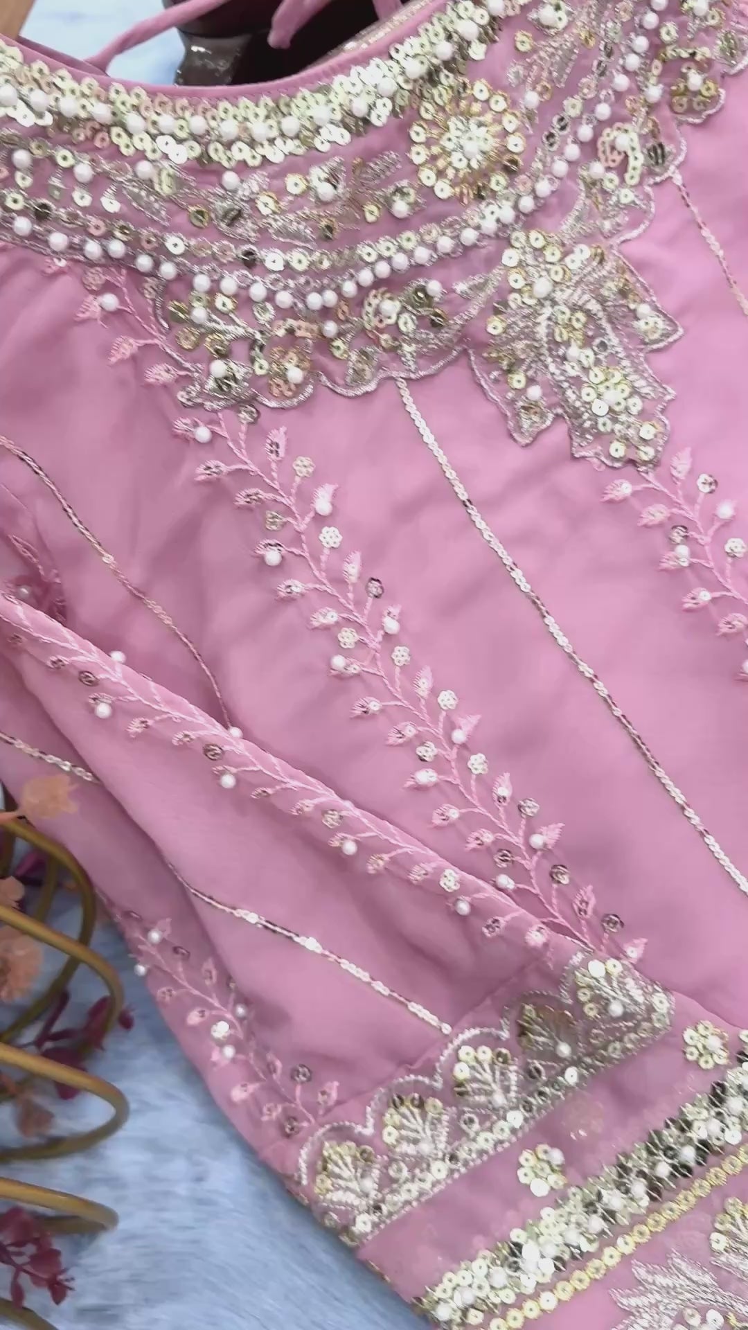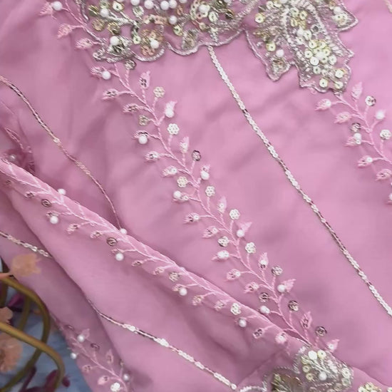 - Fabric: Heavy Faux Georgette with 3mm & 5mm Sequin Embroidery, Rivet Moti Work, and Fancy Latkan Border