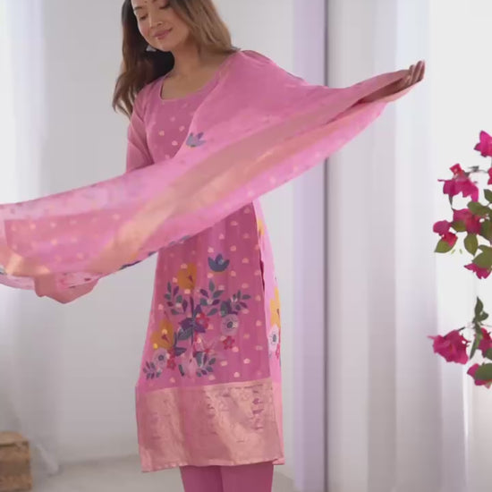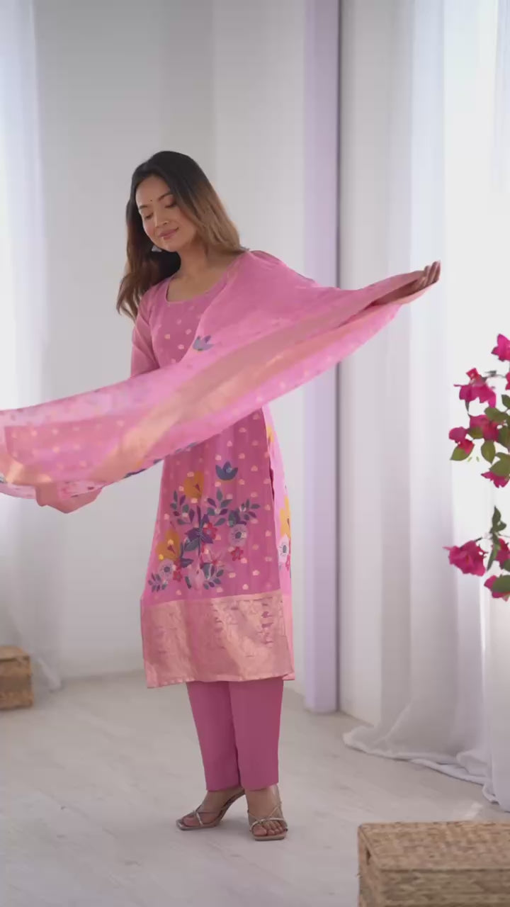 Elegance meets tradition in this beautifully crafted co-ord set featuring a Chanderi Silk top and dupatta with Jacquard work and digital print. Paired with a comfortable micro cotton pant, this outfit is perfect for festive occasions and graceful evenings.