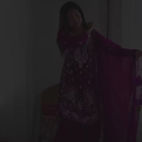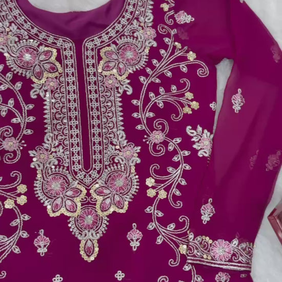 Grace meets glamour in this elegant sharara set designed in luxurious faux georgette. Featuring heavy thread and sequin work on both front and back of the top, this ensemble ensures you sparkle from every angle.